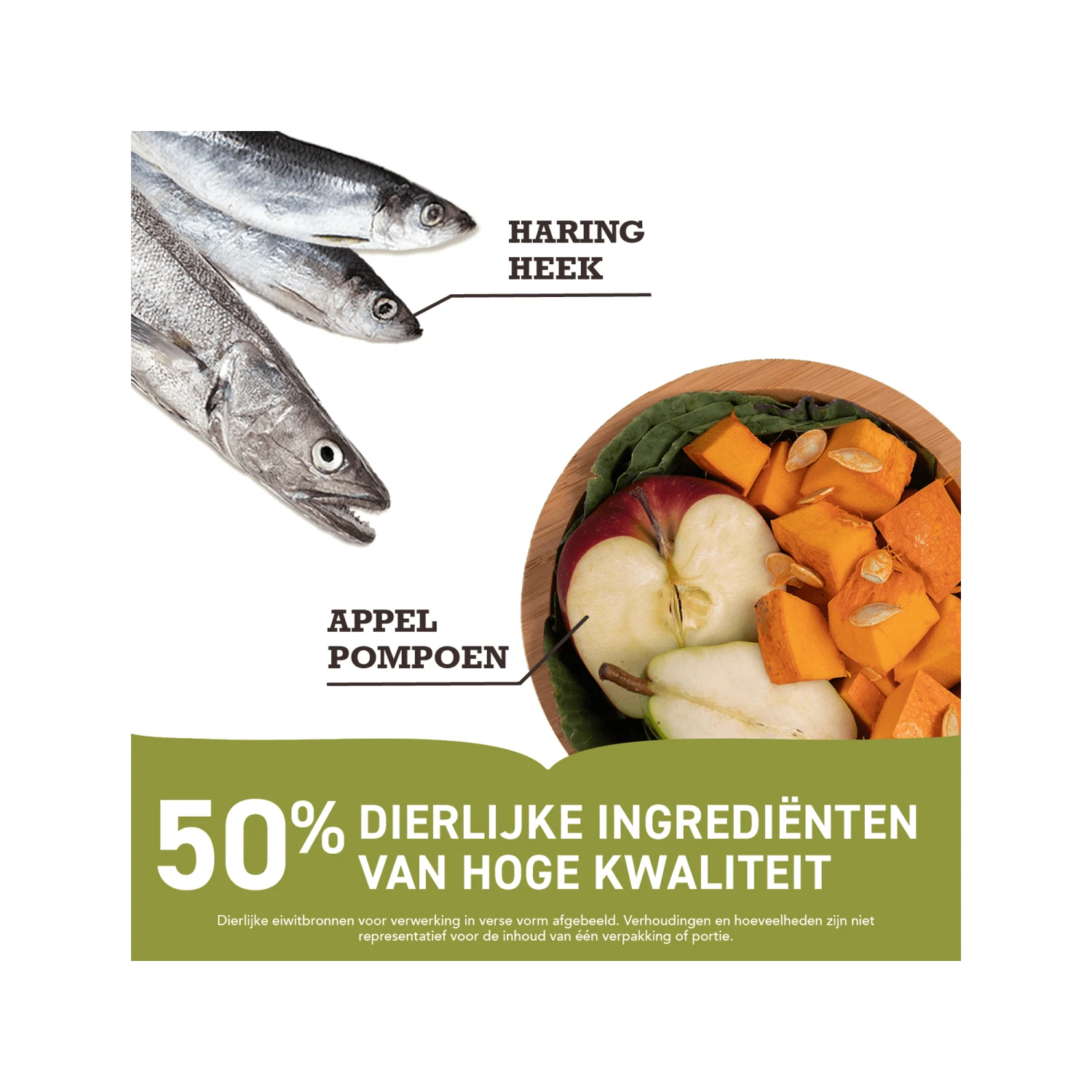 Rauwe zalm (22 %), gedroogde haring (19 %), parelgort, hele erwten, havergrutten, varkensvet (8 %), hele haver, kikkererwtenvezel, visolie (1 %), calciumcarbonaat, kaliumchloride, gedroogde kelp, zout, gedroogde cichoreiwortel, verse hele pompoen, verse hele flespompoen, verse hele wortels, verse hele appels, verse hele peren, verse hele courgette, verse boerenkool, verse spinazie, verse raapstelen, vers bietenloof, hele veenbessen, hele bosbessen, hele Saskatoon-bessen, kurkuma, mariadistel, kliswortel, lavendel, heemstwortel, rozenbottels.