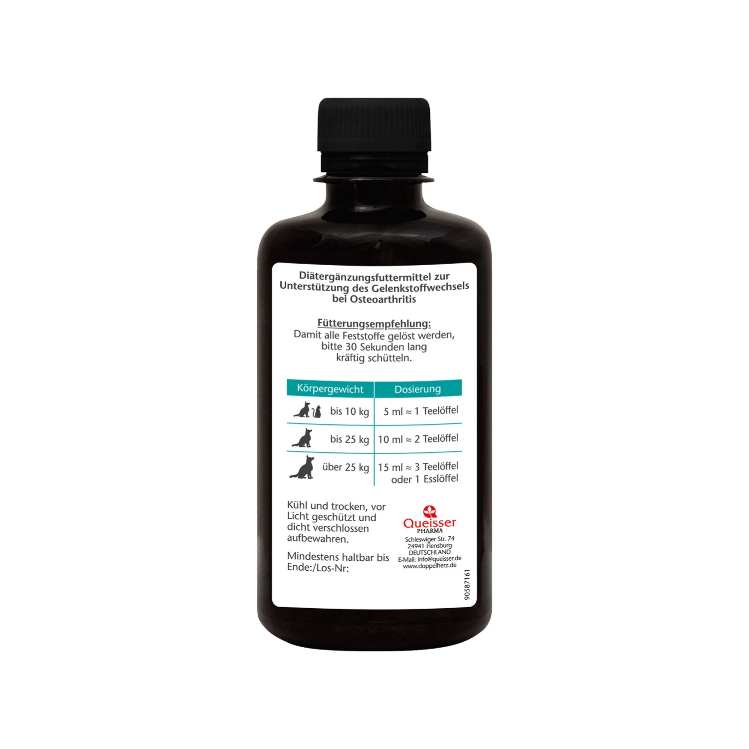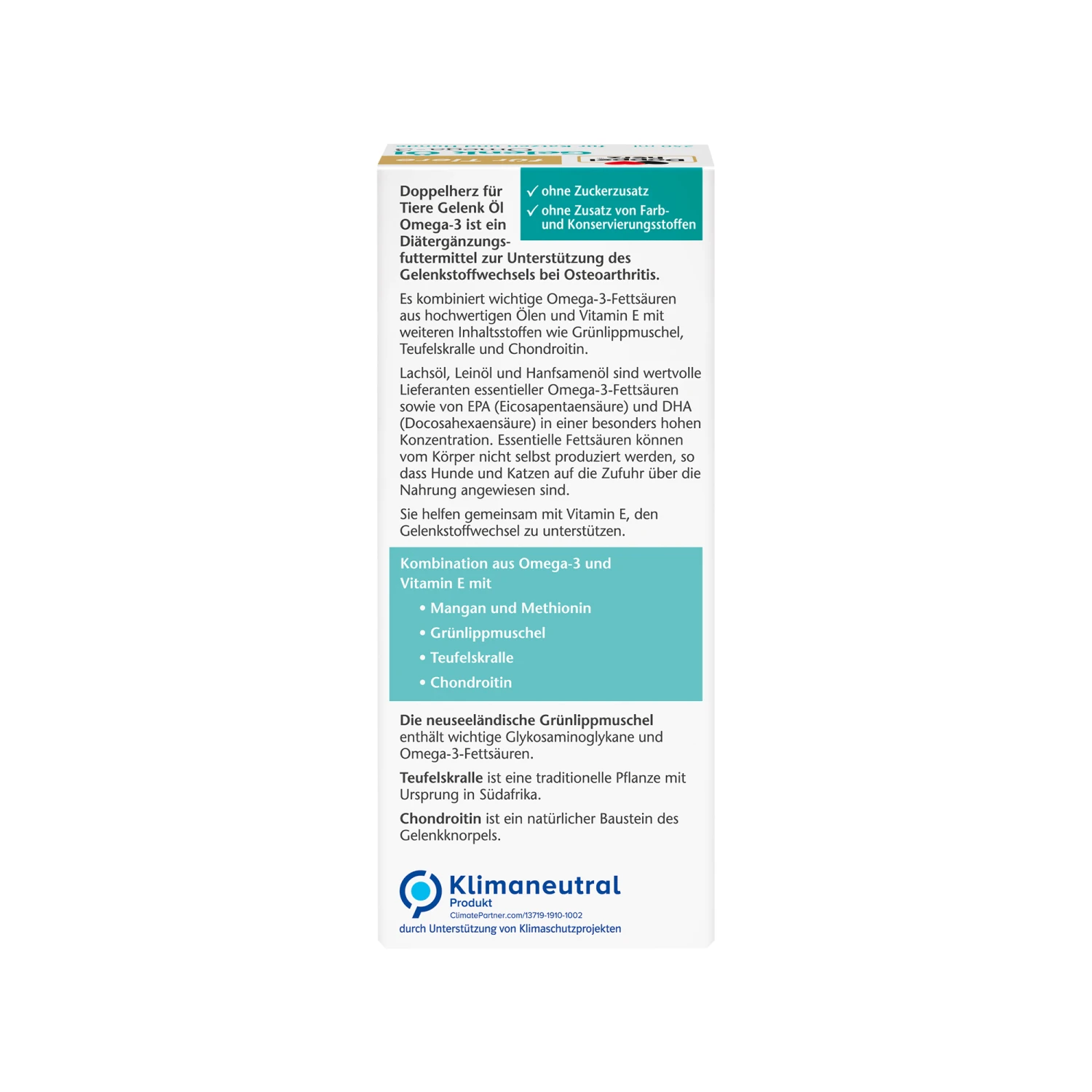 Het hoogwaardige oliemengsel Doppelherz Gelenk Olie is geschikt voor honden en katten. Het ondersteunt de gewrichtsstofwisseling bij osteoartritis. Het bevat de belangrijke omega-3-vetzuren uit zalmolie, hennepzaadolie en lijnzaadolie om de gewrichten te ondersteunen. Daarnaast zit er ook nog groenlipmosselpoeder, vitamine E, duivelsklauw en chondroïtine.