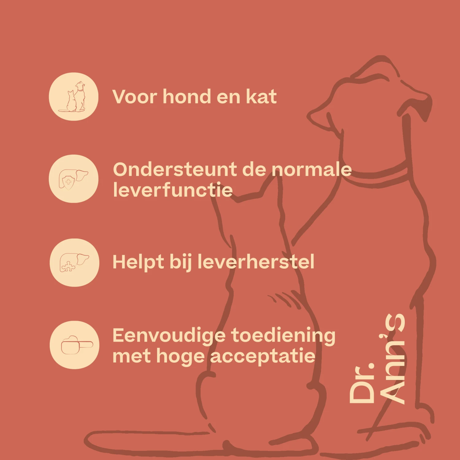 De lever is zonder twijfel een cruciaal orgaan in het lichaam. Zo speelt het een belangrijke rol bij de vertering van voedingsstoffen zoals vet. Ook worden veel voedingsstoffen opgeslagen in de lever. Het lichaam kan hierdoor altijd van energie voorzien worden. De lever zorgt voor zuivering van afvalstoffen en produceert belangrijke eiwitten die nodig zijn voor o.a. het bloed en het immuunsysteem. Dr. Ann’s Liver Support is een supplement voor honden en katten ter ondersteuning van de lever.