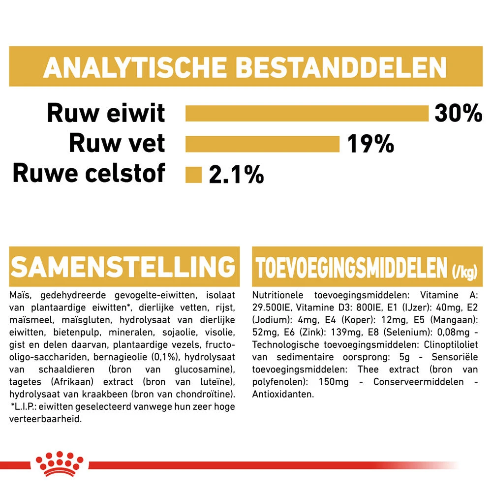 Maïs, gedehydreerde gevogelte-eiwitten, isolaat van plantaardige eiwitten*, dierlijke vetten, rijst, maïsmeel, maïsgluten, hydrolysaat van dierlijke eiwitten, bietenpulp, sojaolie, mineralen, visolie, gist, plantaardige vezels, Fructo-Oligo-Sacchariden, bernagieolie (0.1%), extracten uit groene thee en druiven (bron van polyfenolen), hydrolysaat van schaaldieren (bron van glucosamine), tagetes (Afrikaan) extract (bron van luteïne), hydrolysaat van kraakbeen (bron van chondroïtine)