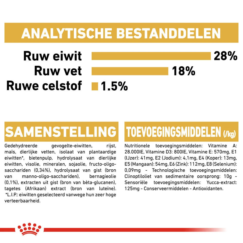 Rijst, gedehydreerde gevogelte-eiwitten, maïs, dierlijke vetten, isolaat van plantaardige eiwitten, bietenpulp, hydrolysaat van dierlijke eiwitten, mineralen, visolie, sojaolie, Fructo-Oligo-Sacchariden, hydrolysaat van gist (bron van Manno-Oligo-Sacchariden), bernagieolie (0.1%), tagetes (Afrikaan) extract (bron van luteïne).