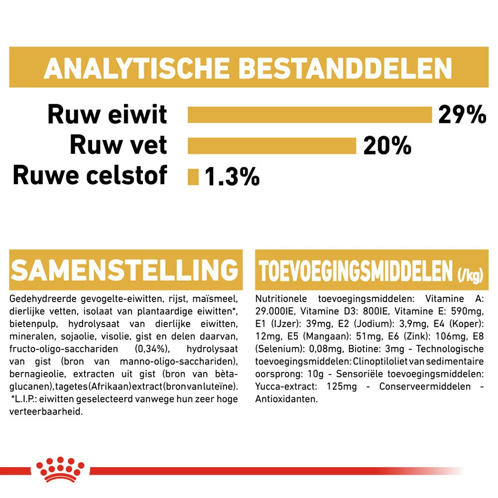 Gedehydreerde gevogelte-eiwitten, rijst, maïsmeel, dierlijke vetten, isolaat van plantaardige eiwitten, bietenpulp, hydrolysaat van dierlijke eiwitten, mineralen, sojaolie, visolie, gist, Fructo-Oligo-Sacchariden, hydrolysaat van gist (bron van Manno-Oligo-Sacchariden), bernagieolie (0,1%), tagetes (Afrikaan) extract (bron van luteïne).